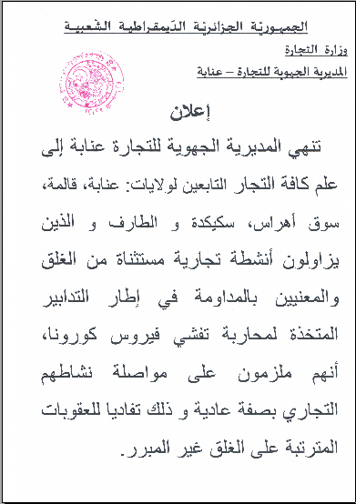 إعلان خــاص بالتجـــــار التابعين لناحية عنابة والمعنييـــن بالمداومة